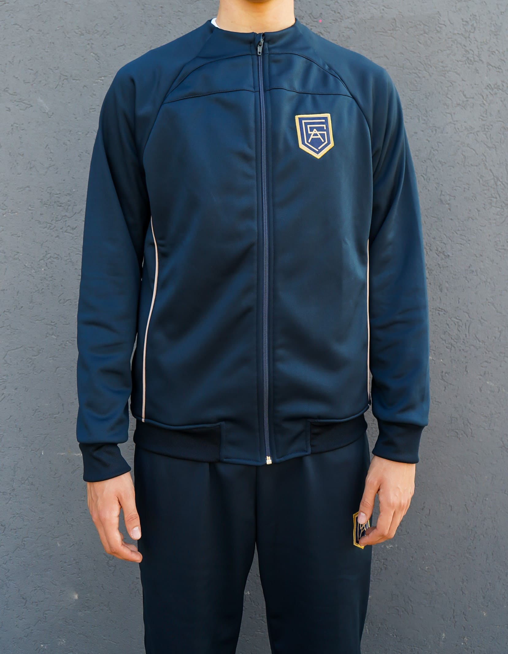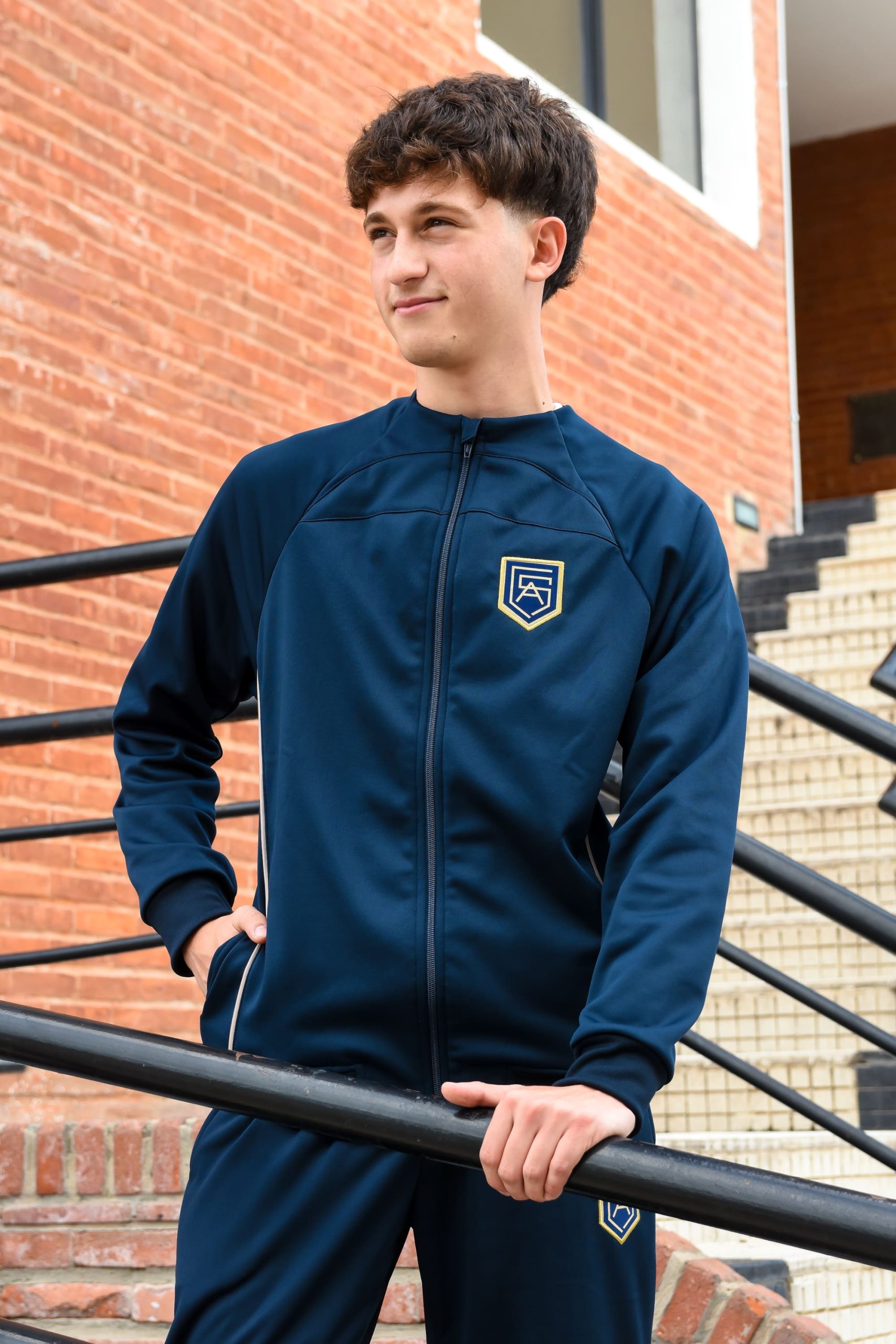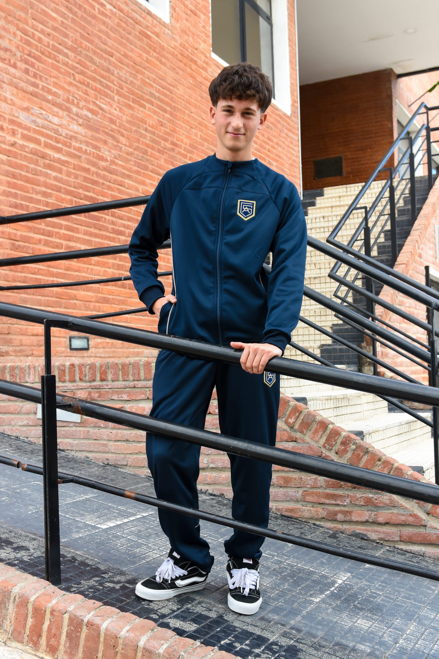 Campera deportiva therma en color azul marino con vivos en ocre y escudo de la institucion.